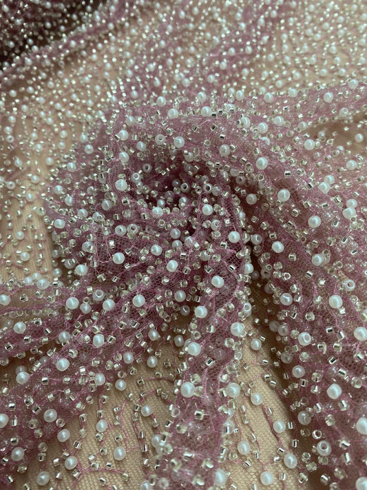 Tulle accesorizat cu perle si margele tubulare , Roz Pudra - MODEL HACER