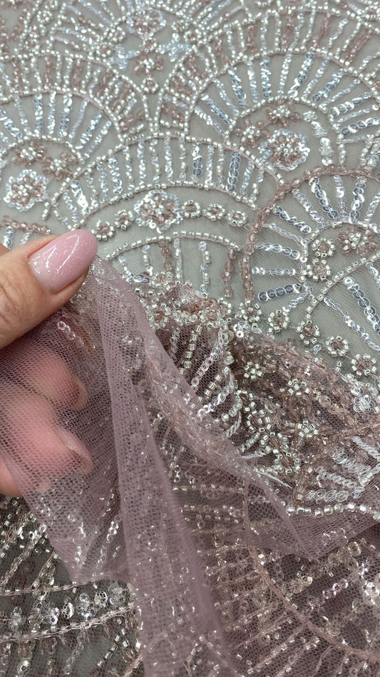 Broderie argintie , accesorizata cu paiete si margele, pe suport de tulle roz - MODEL DENY