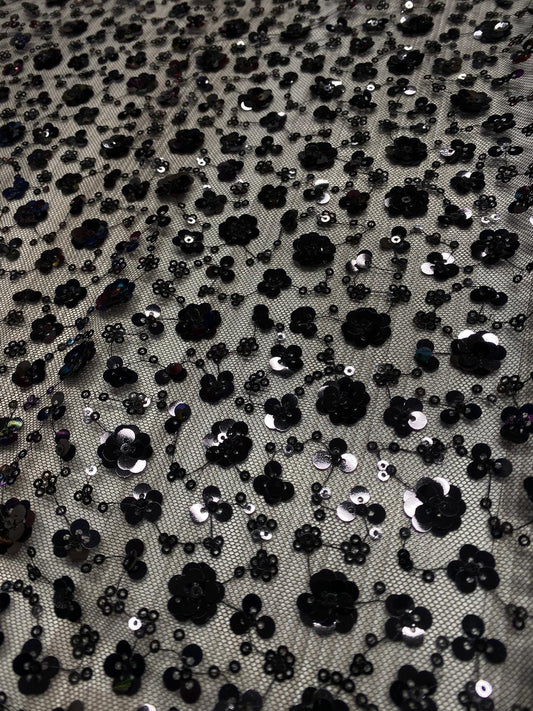 Tulle accesorizat cu floricele din paiete , Negru