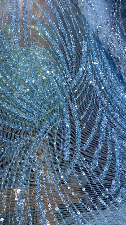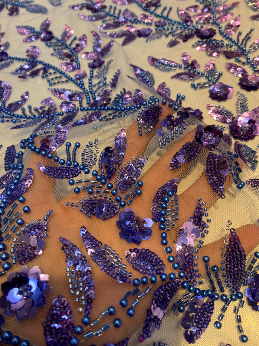 Broderie accesorizata cu paiete si margele albastre si mov , pe suport de tulle albastru