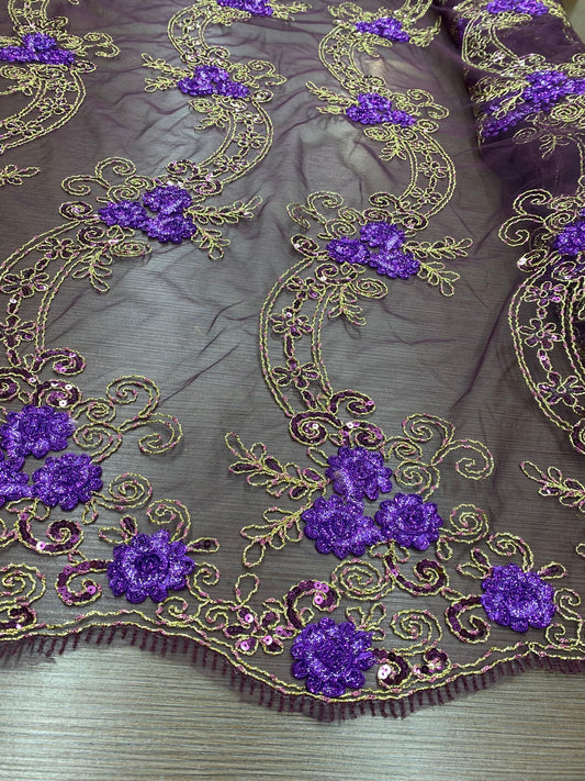 Broderie pe tulle, fir lame auriu cu flori 3D mov