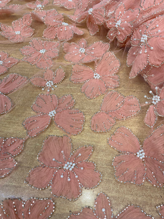 Broderie accesorizata cu paiete si margele, culoare Somon, Model Floral SMT