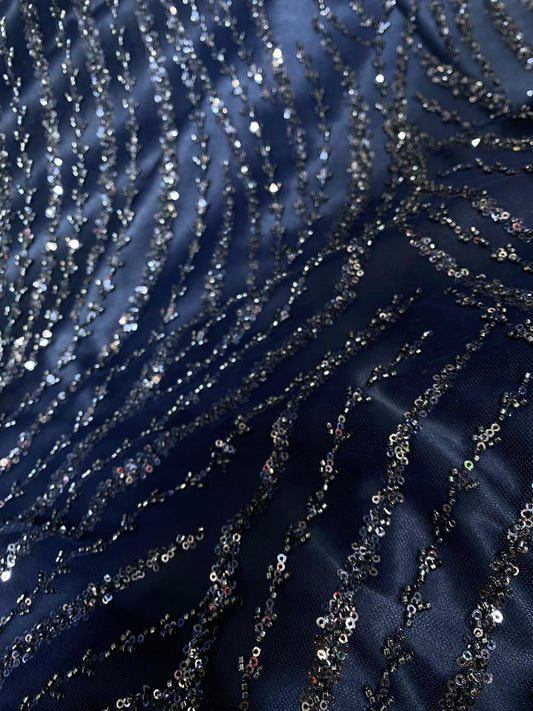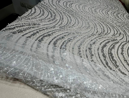 Broderie accesorizata cu paiete si margele, Argintiu pe tulle negru - MODEL ARRY