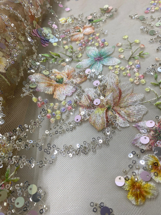 Broderie premium accesorizata Flori 3D, design multicolor, tulle Galben Pal, Model FAVI
