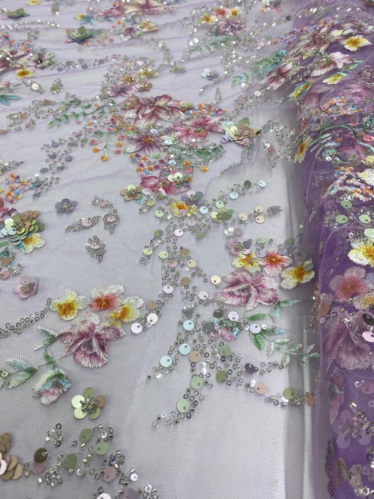 Broderie premium accesorizata Flori 3D, design multicolor, Tulle Mov, Model FAVI