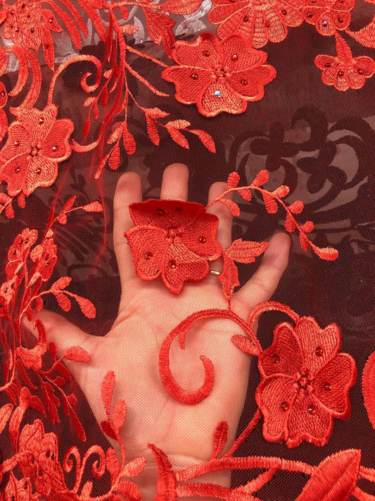 Broderie pe tulle cu flori 3D , Rosu / MODEL ALARA