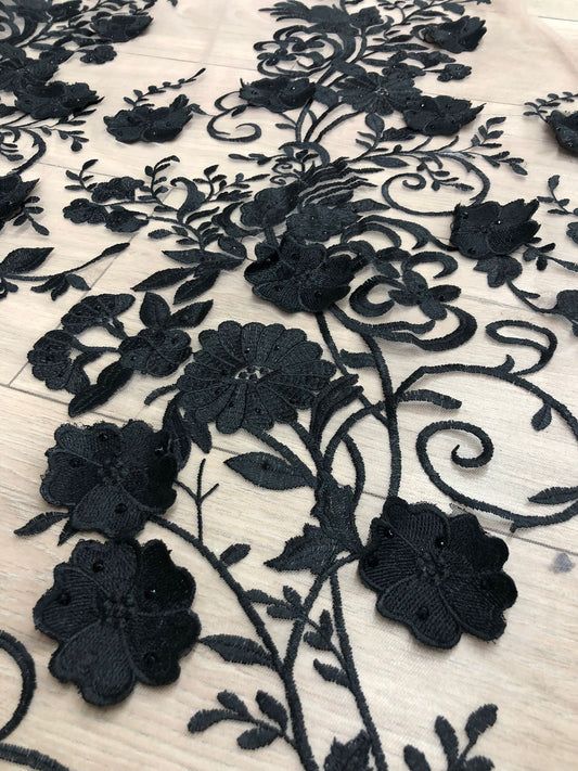 Broderie pe tulle cu flori 3D , Negru / MODEL ALARA