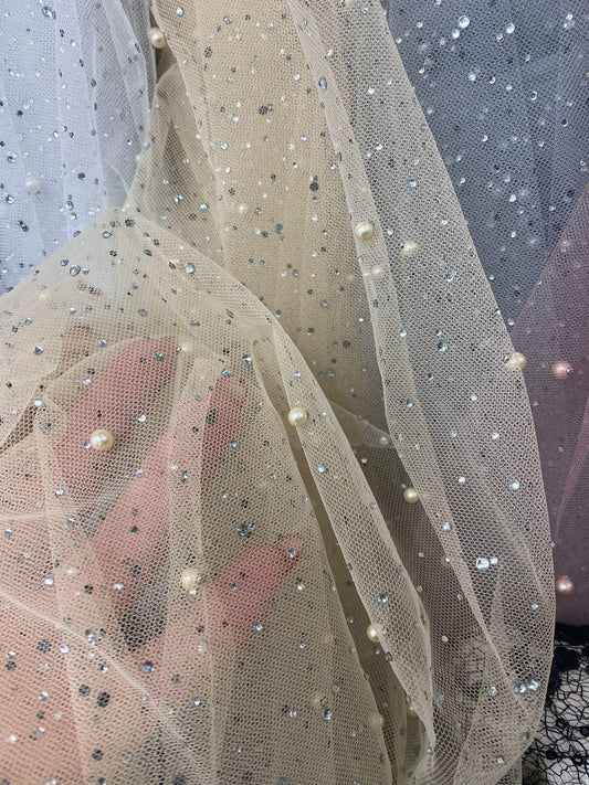 Tulle accesorizat cu strasuri si perle , Bej