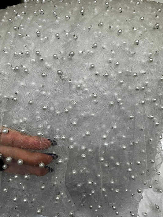 Tulle accesorizat, plin cu perle, Alb
