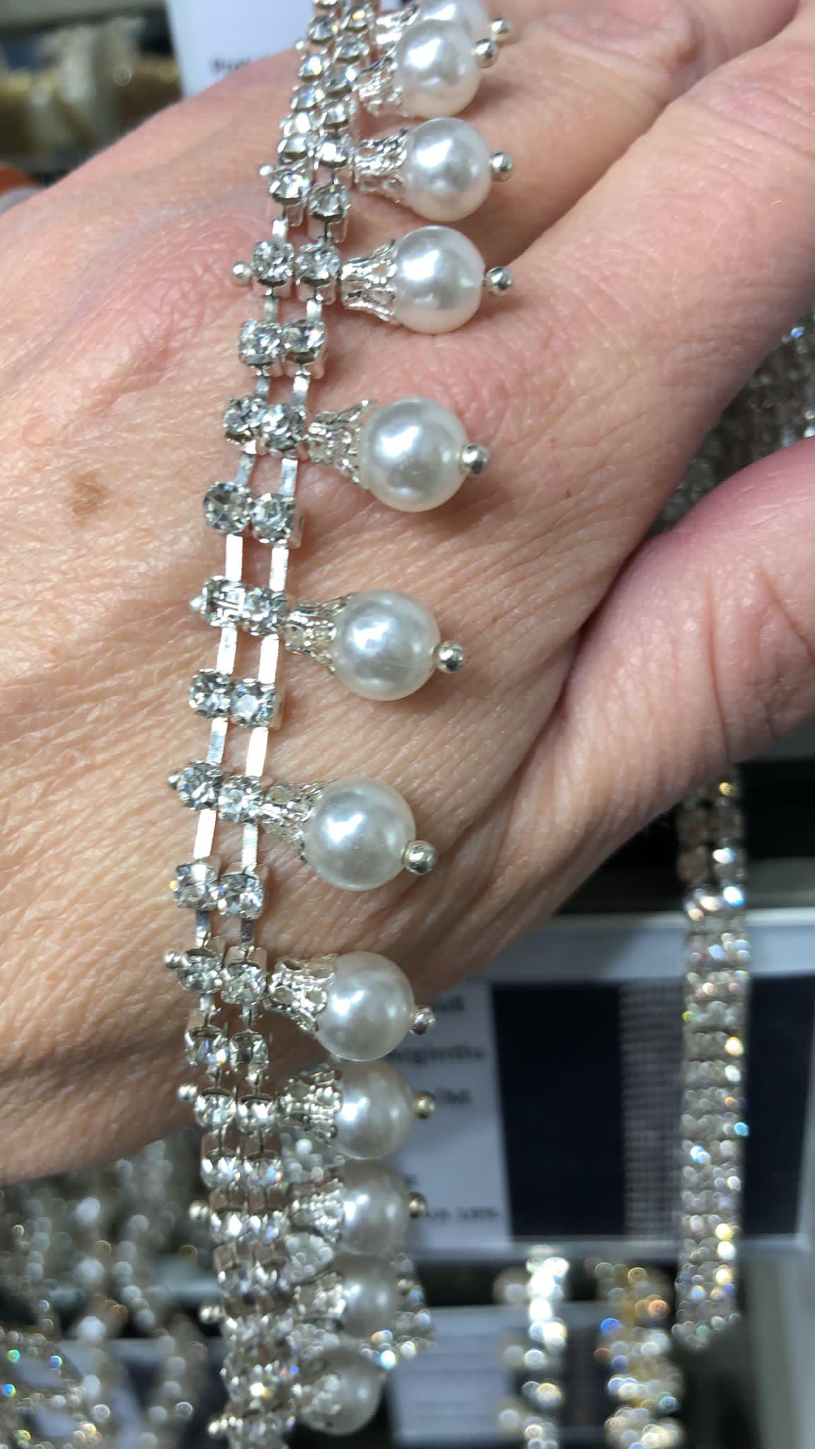 - Aplicatie argintie cu strasuri mici si perle mari , pe suport metalic