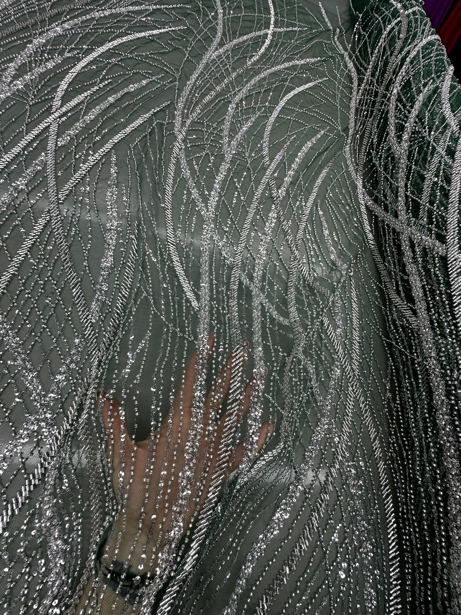 Broderie accesorizata cu paiete si margele argintii , pe tulle verde .