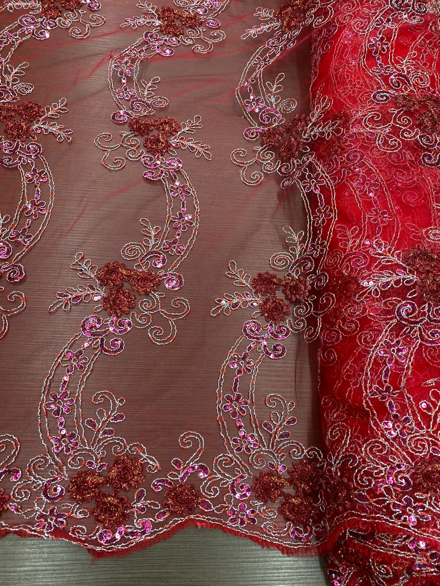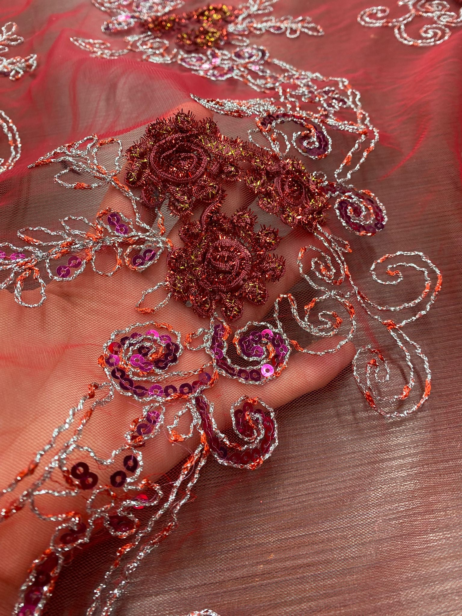 Broderie pe tulle Rosu cu paiete Fuxia si fir lame, model 3D