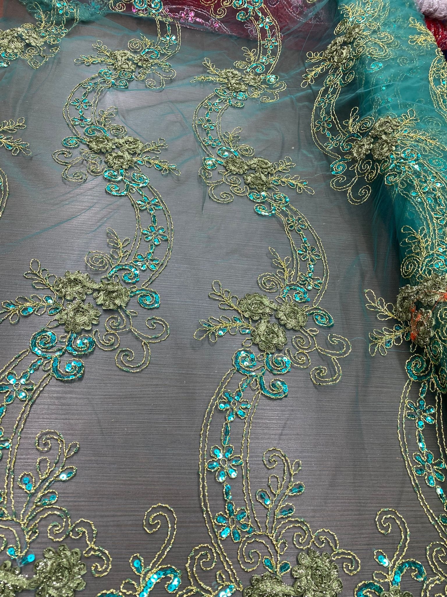 Broderie pe tulle Turqoise cu paiete fir lame, model 3D